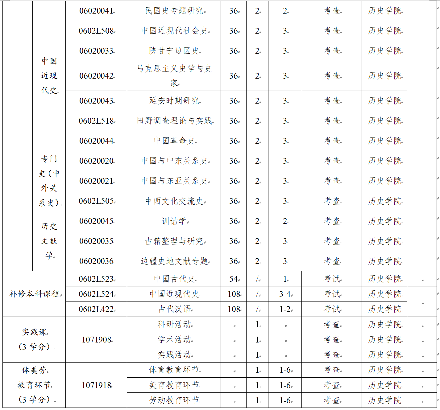 中国史专业研究生必须完成 1 项与本学科相关的研究工作,具体形式可为参与科研课题研究、古籍整理、撰写研究报告、决策咨询报告、社会调研等,各学科可根据实际情况作出具体要求,由指导教师进行考核,考核合格后获得 1 个学分。