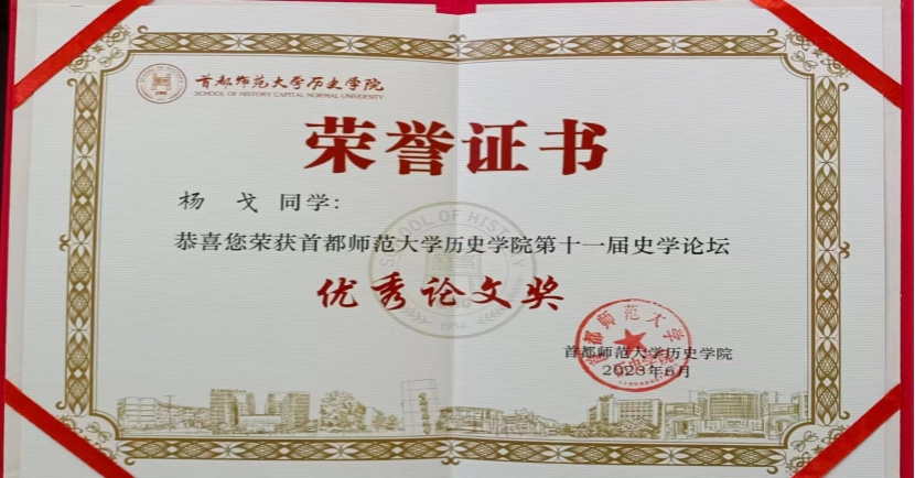 1、2023年6月由21级硕士研究生杨戈撰写的论文《汉魏六朝史评中的汉桓帝形象》获首都师范大学beat365英国官网网站第十一届史学论坛优秀论文奖