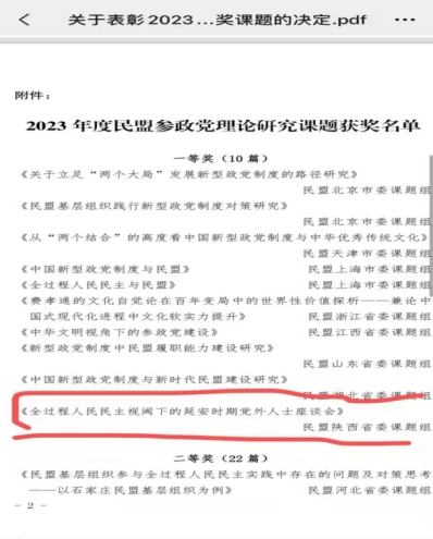 2、2023年12月由张雪梅、杨千琦(22级硕士)合写的论文《全过程人民民主视阈下的延安时期党外人士座谈会》获得2023年度民盟参政党理论研究课题一等奖