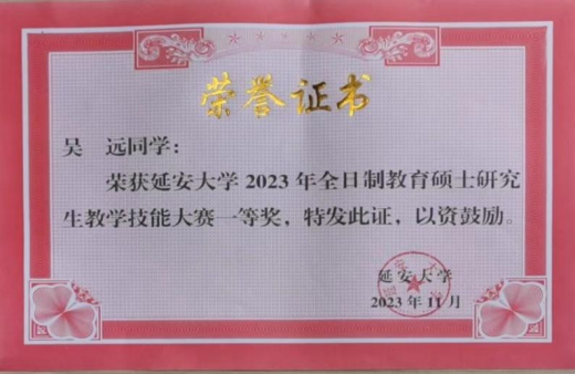 3、2023年11月2023级硕士研究生吴远荣获延安大学2023年全日制教育硕士研究生教学技能大赛二等奖