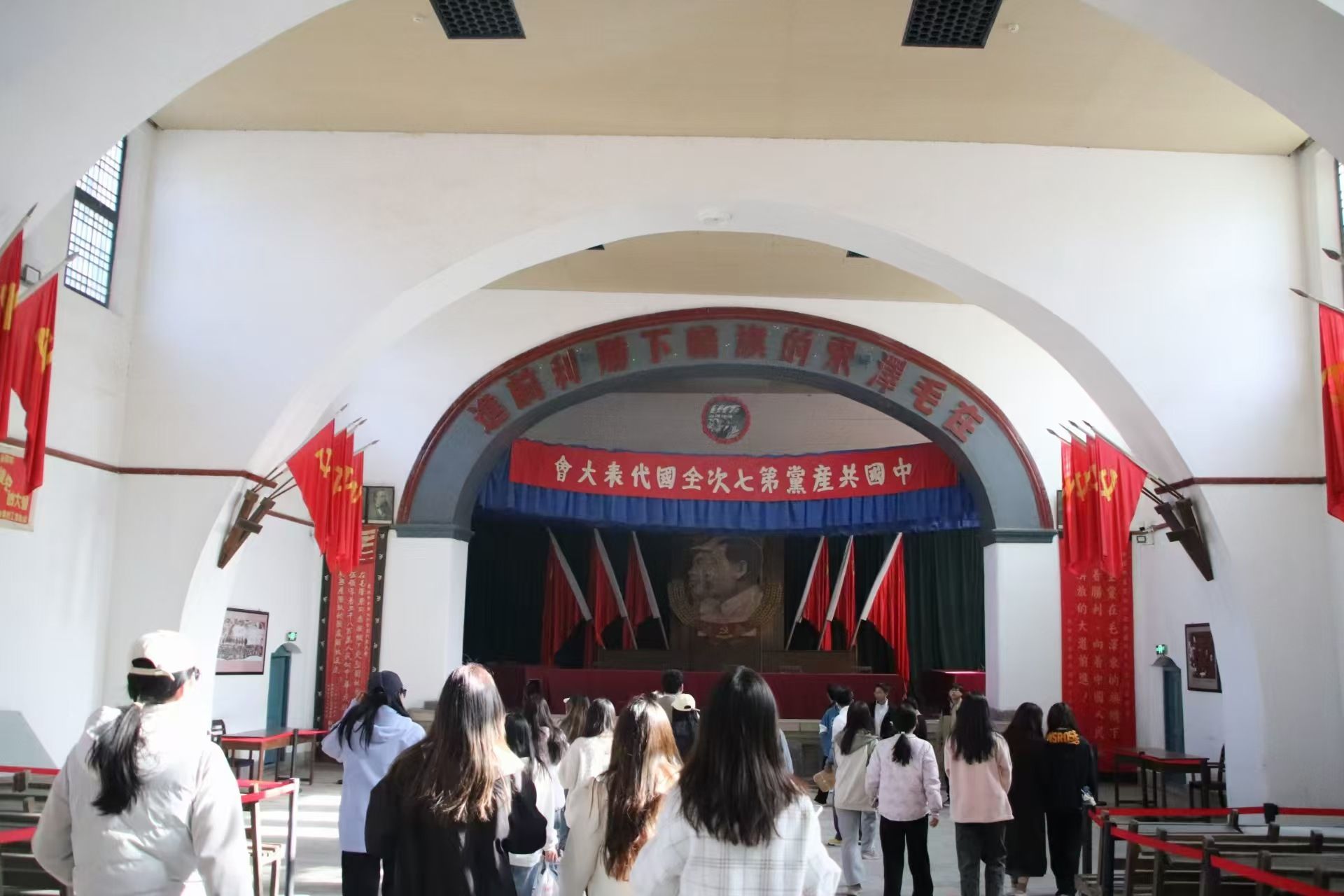 在中共七大会址——杨家岭中央大礼堂前,鲜艳的党旗迎风飘扬,庄严肃穆的建筑见证着一段光辉历程。学子们驻足凝视会场内的陈设,认真聆听关于大会历史的讲解。同学们纷纷表示,置身这一堪称"党的建设史上的里程碑"之地,对"思想上政治上组织上的统一团结"的重要性有了更深刻的理解。