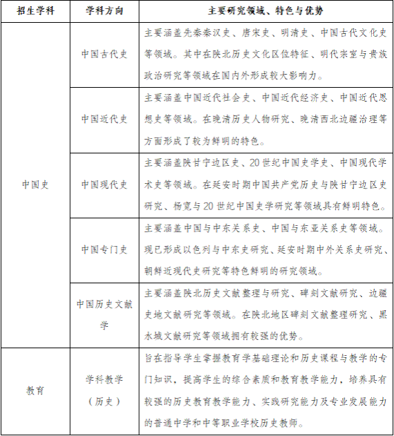 公司现有中国史一级学科硕士学位授权点,下设中国古代史、中国近代史、中国现代史、中国专门史、中国历史文献学5个研究方向。此外还设有学科教学(历史)二级学科专业学位授权点。现有硕士研究生导师29人,其中本院导师26人、外院导师2人、校外兼职导师1人,在校硕士研究生人数124人。公司设有陕北历史文化研究中心(陕西省哲学社会科学重点研究基地)、陕西省人民政协理论与实践研究基地、陕西地区韩国独立运动研究与韩国学教育研究基地等研究平台3个,地方历史文献与文物数字化实验室1个,微格教学实验室1个,资料室1间(中、外文期刊80多种,藏书共计10万余册)。
