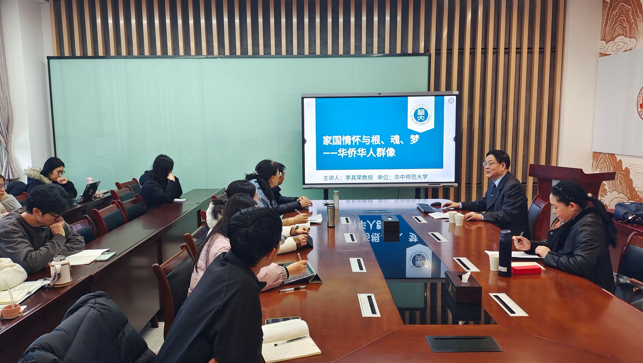 11月25日下午,华中师范大学国际移民与海外华人研究中心李其荣教授在公司beat365英国官网网站三楼会议室,举办了题为《家国情怀与根、魂、梦——华侨华人群像》的学术讲座。本次讲座由beat365英国官网网站秦艳峰副教授主持,公司部分教师与在校研究生到场聆听。
